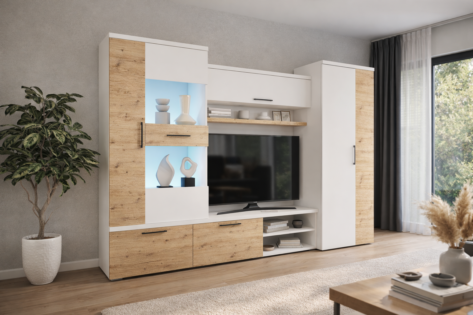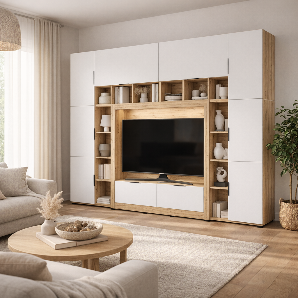• nappaliba (zárt + vitrines + TV-környéki elemek).